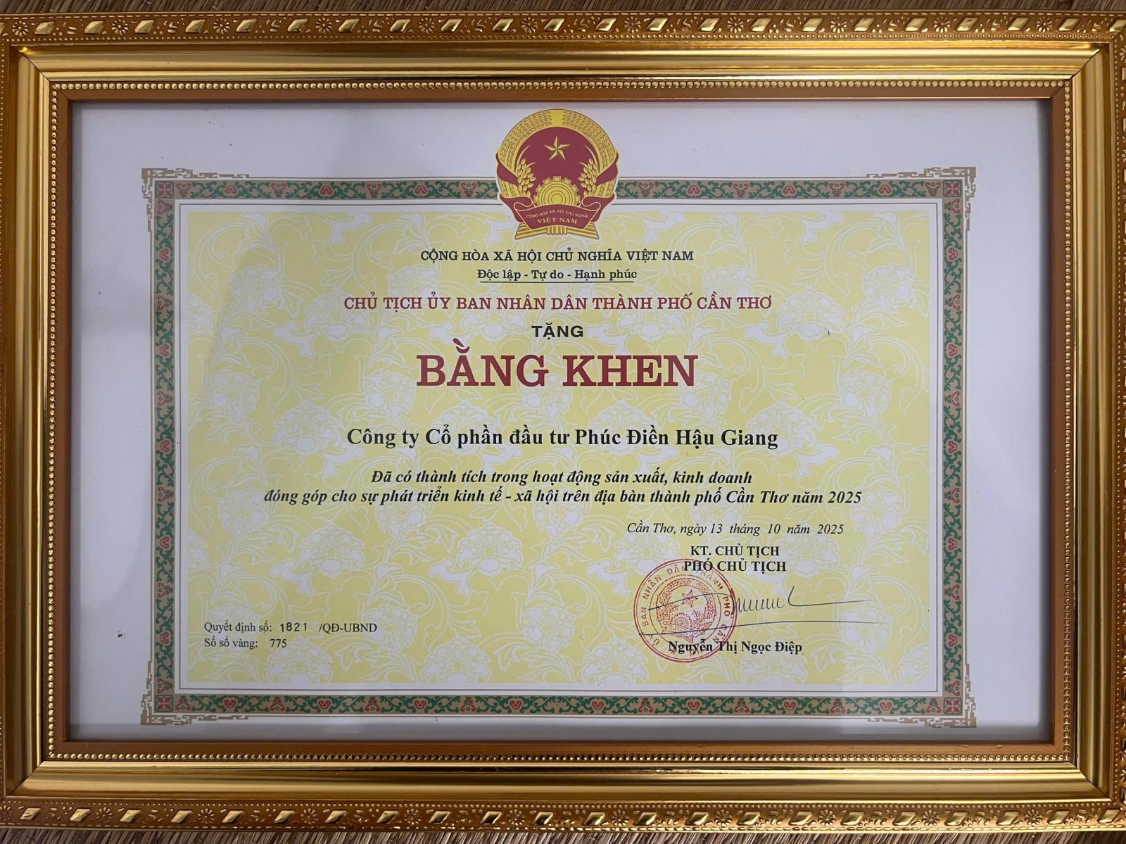 Công ty Cổ phần Đầu tư Phúc Điền Hậu Giang đã vinh dự nhận được Bằng khen từ Chủ tịch UBND Thành phố Cần Thơ vì đã có thành tích trong hoạt động sản xuất, kinh doanh đóng góp cho sự phát triển kinh tế - xã hội trên địa bàn Thành phố Cần Thơ năm 2025.